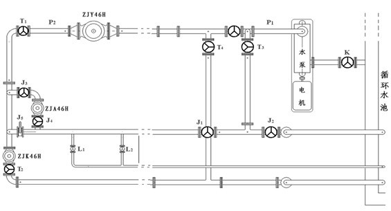 如圖所示:4位置活塞式減壓閥, 分別為ZJY46H-25C DN450活塞式減壓閥;壓力表(P1、P2)精度為0.4級,并具有穩流管和旋塞調節閥;測流流量計為電磁式或超聲波式均可,安裝于被測閥4后的規定位置。