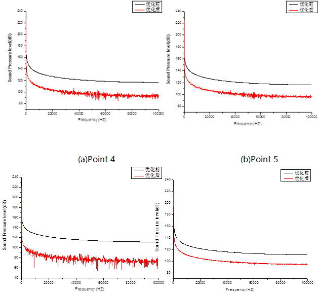 優化前后的減壓閥有相同趨勢的聲壓級圖,優化節流錐型線后的減壓閥聲壓級平均下降了20dB以上,并且優化后的減壓閥聲壓級脈動性較未優化明顯,達到一定的減噪要求。