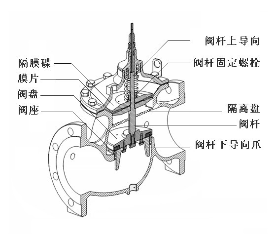 當P1上升時,減壓閥的P2+ΔP2首先表現為上升,其值通過反饋系統出口管傳到控制閥,使Pt′+ΔPt′,ΔPt′與Pk′的力達到新的平衡,控制閥h減?。幌鄳k′壓力增大,經壓力導管,使主閥的Pk+ΔPk,Pt=Pk+ΔPk壓力達到新的平衡,主閥h減小、ΔP2值恢復為原P2值。當進口壓力P1下降時,主閥與控制閥的工況則與上述的工況相反。